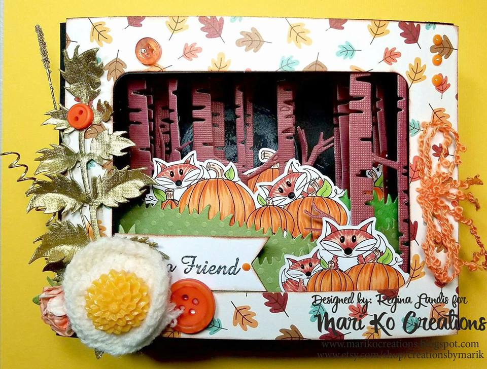 I am on a shadow box/diorama kick lately. This is my second one and I am having so much fun. It's hard to tell in the pic, but the papers bow out; it's not flat across like a tv. Mama fox and her baby are featured right in front. Then I added in some foxes with their pumpkins and plain old pumpkins behind them. I colored everything with copics: C00, E07, E08, E21 - 25, E33, E37, YR 07, YR12 and YR14. This is the first time I've colored pumpkins with four or five different colors. How did I do?